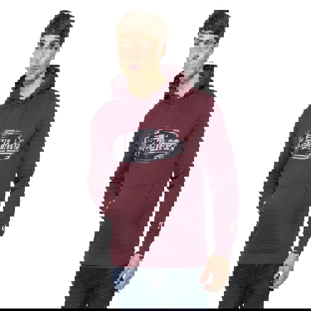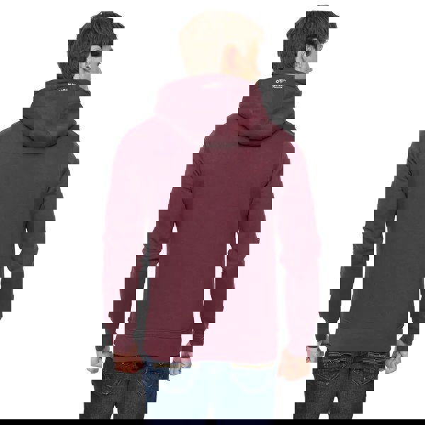 Crosshatch Hellmere hoodie in Rum Raisin, made from a cotton and polyester blend. The design includes a printed logo and text, finished with a woven label for a clean branded detail. A hooded neckline and long sleeves keep the silhouette classic, while the pull-over fastening maintains a simple, everyday shape.