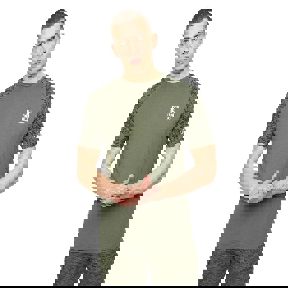 The Crosshatch Janscore T-shirt comes in deep olive with a camo and logo design. Made from 100% cotton, it has a crew neck and short raglan sleeves for a clean, casual finish. A regular fit keeps the shape straightforward and easy to wear on its own or as a base layer.