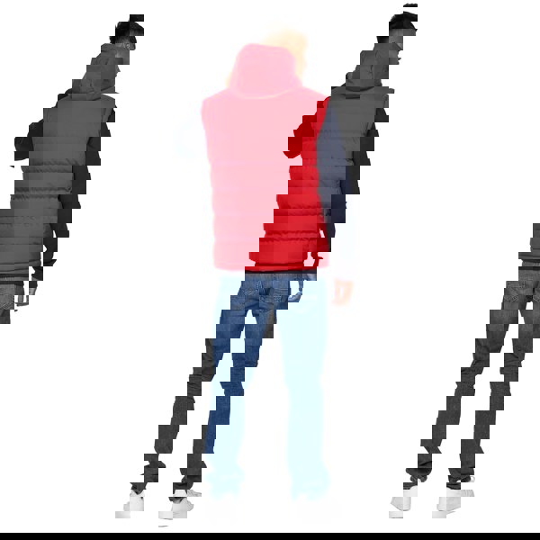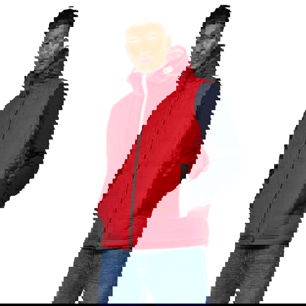 This sleeveless gilet is made with a 100% polyester outer, lining and filling. The woven nylon fabric is finished with a quilted construction and embossed logo detailing. A grown-on hood creates a hooded neckline, with a bungee cord and toggle adjuster for adjustment.