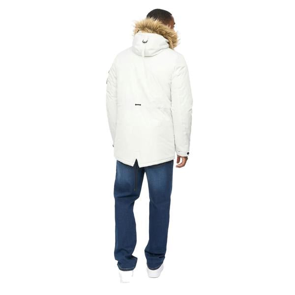 The Crosshatch Parkmoore MVE parka is made from 100% polyester with a lined, padded construction. Finished in putty with a plain design, it includes a badge detail for a clean, branded look. A hooded neckline adds coverage, with a drawcord and faux fur trim for a defined finish.