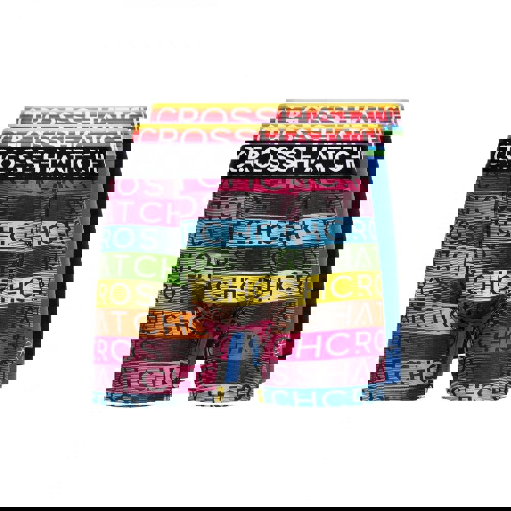 This pack of three men’s boxer shorts from Crosshatch comes in a rainbow mix selection in black. The set includes assorted designs, combining all-over print and plain styles, with logo detailing for a branded finish. Each pair is completed with a woven jacquard waistband with branded detailing.