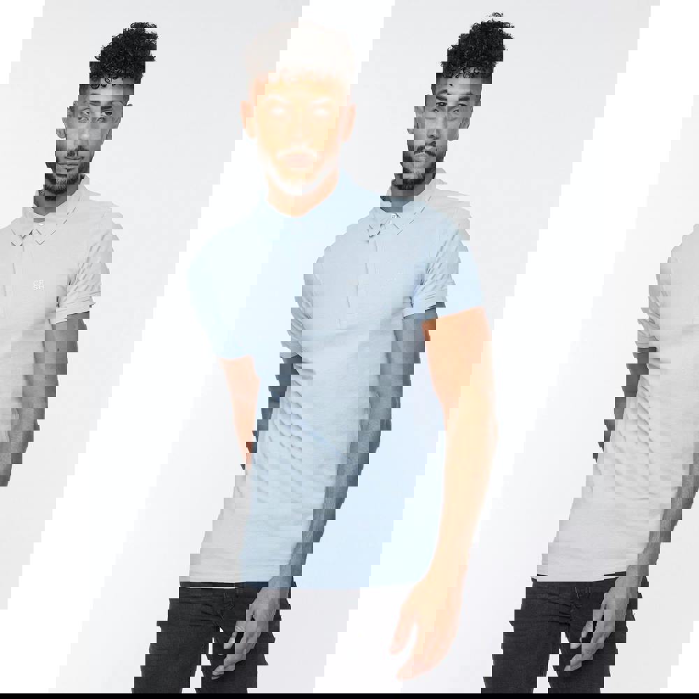 The Crosshatch Sullivan polo shirt comes in light blue with a plain finish and logo detailing. Made in piqué, it has a collared neckline and short sleeves for a classic polo profile. A concealed placket keeps the front neat, while back neck tape adds a clean internal finish. Raised rubber detail completes the look with a subtle branded touch.