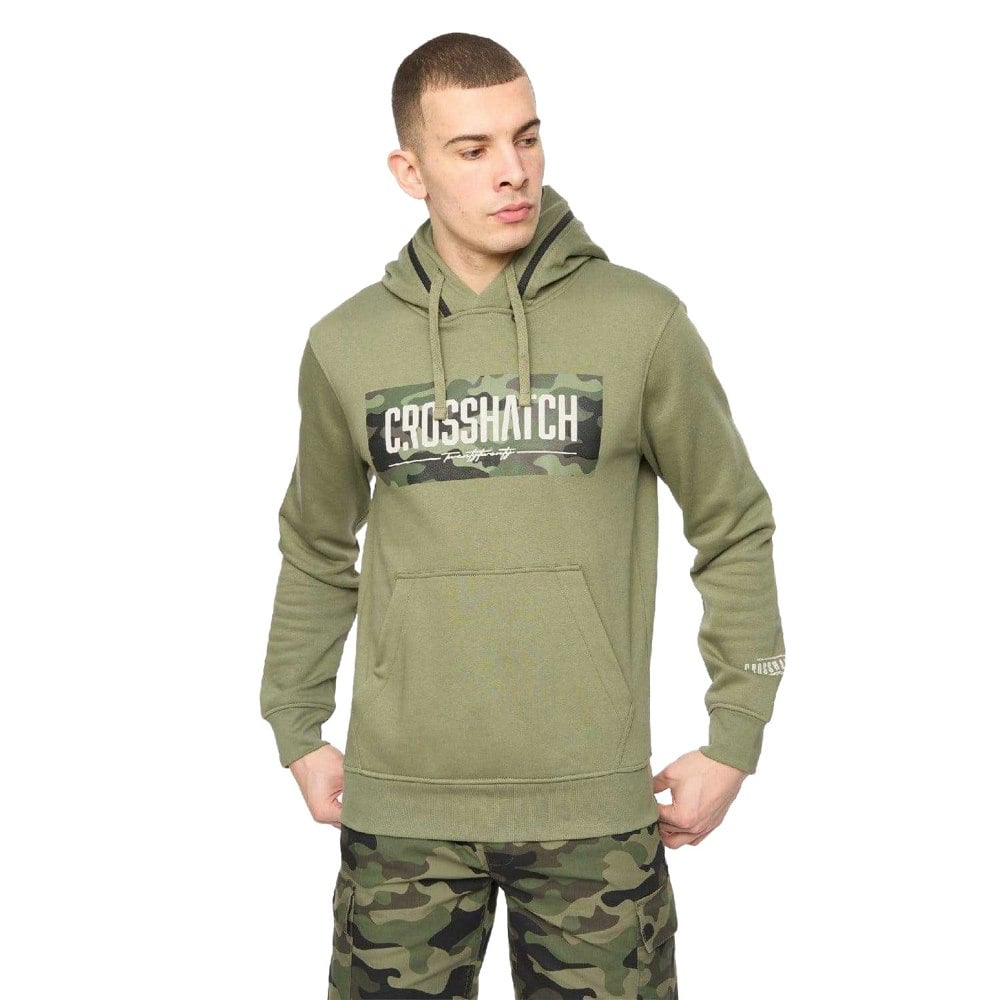 Crosshatch Camtort hoodie in green, made from a cotton and polyester blend with a fleece fabric. The design includes a logo and a hooded neckline with a drawstring and sew-on hood construction. Cut in a regular fit, it works well for everyday casual wear and layering.