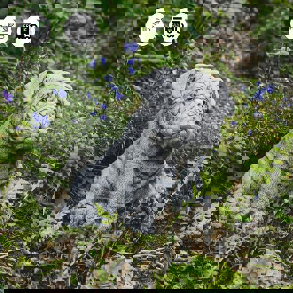 The most fantastic model of a sitting, stone, bulldog puppy with lovely big eyes. A breathtakingly realistic addition to any house or garden décor or could even serve as a beautiful headstone as a memorial to a departed beloved pet. This statue is stone cast and solid, built to last a lifetime.