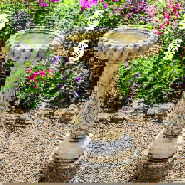 Attract the birds to your garden with this beautiful flower shaped birdbath. The pedestal features a lovely leaf and vine design, with a flower shaped bowl featuring details to the petals to give the look of a daisy flower head. The bird bath comes in two parts: the bowl and the pedestal. Introduce a delightful touch to your outdoor living space with this functional garden arrangement. With its aged looking rustic finish and loveable drawn picture this stone cast birdbath surely is going to be a centrepiece for wildlife.