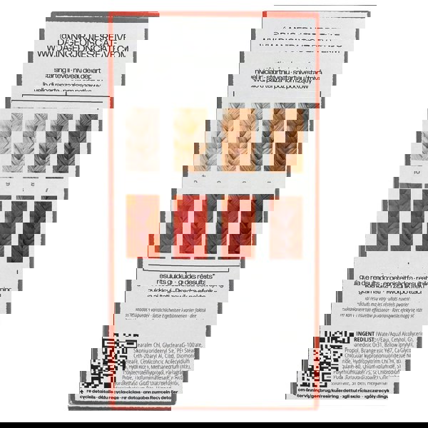 Water/Aqua/Eau, Cetyl Alcohol, Glycerin, Stearalkonium Chloride, Glyceryl Stearate, Propanediol, PEG-100 Stearate, Propanediol, Basic Orange 31, Basic Yellow 87, Caprylyl Glycol, Ceteareth-20, Cetearyl Alcohol, Citric Acid, Didecyldimonium Chloride, Guar Hydroxypropyltrimonium Chloride, HC Blue No. 15, Hydrolyzed Rice Protein, Methylpropanediol, Parfum (Fragrance), Polyquaternium-80, Quaternium-75, Sodium Chloride, Hydroxide, Tetrasodium Glutamate Diacetate, Benzyl Alcohol,Potassium Sorbate, , Sodium Benzoate, Hexyl Cinnamal.