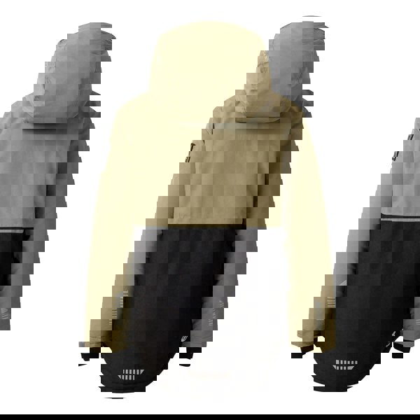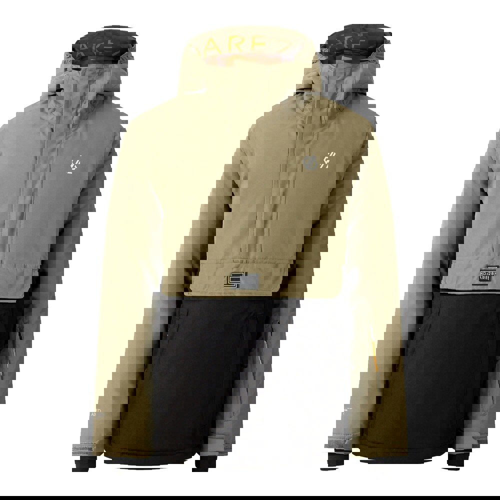 Practical details include a hooded neckline with a standing collar, plus a grown-on hood with elastication. A half zip pullover fastening is supported by a chin guard and inner zip guard. The jacket includes a snowskirt, scrim back panel and side zip. Storage is provided by two side zip pockets, one front pocket with flap closure and hook and loop fastening, and a ski pass pocket.