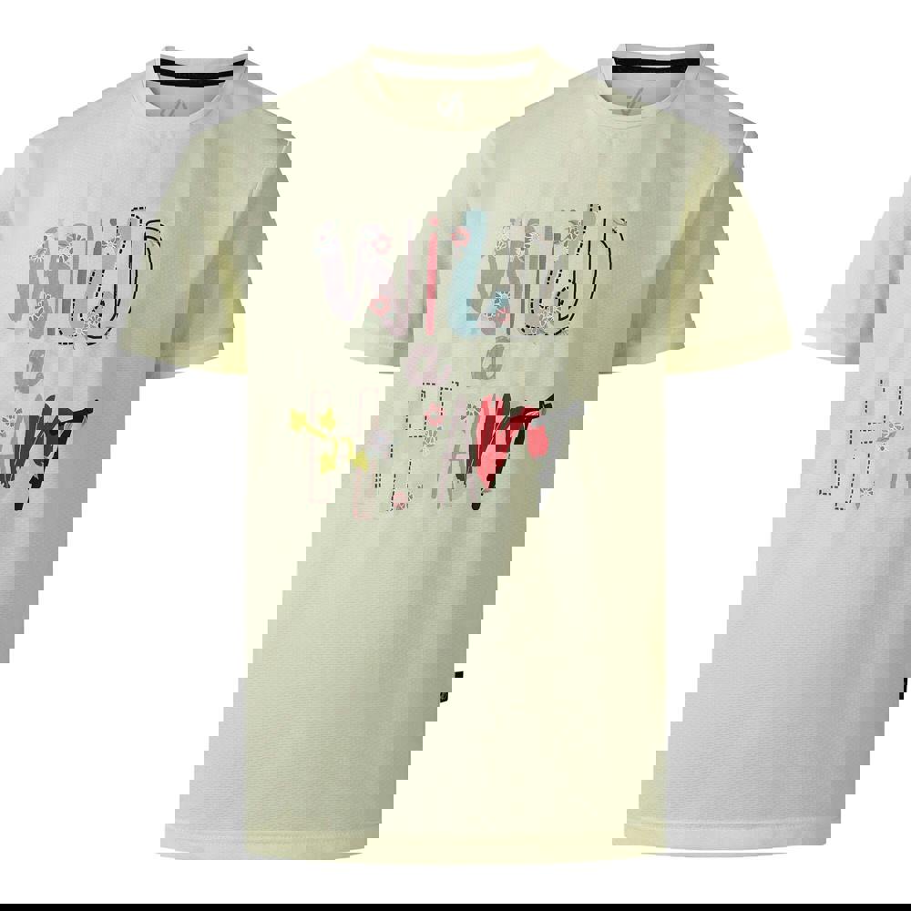 Dare 2B Kids Amusing T-Shirt in wax yellow with a lightweight fabric construction. The design combines flowers with a graphic print and text, finished with a crew neckline and short sleeves.