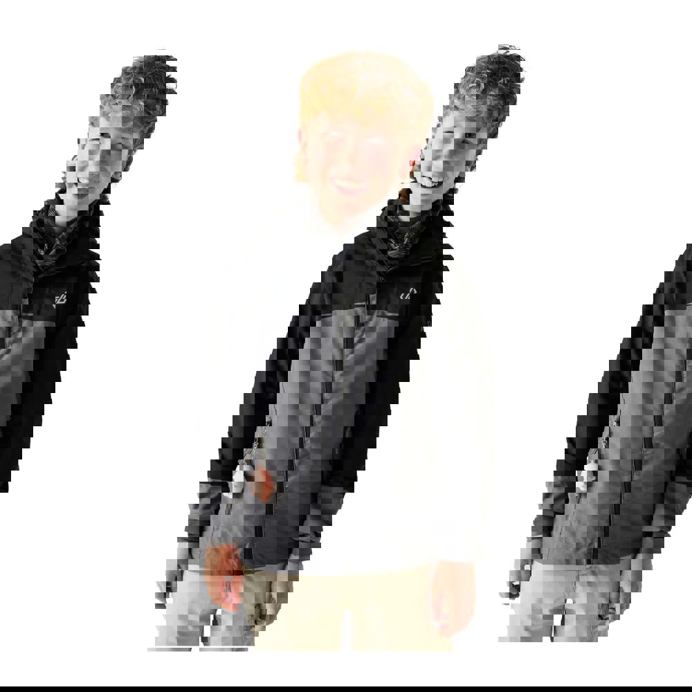 The Dare 2B Kids Explore III Waterproof Jacket in Magnet is made from 100% recycled polyester, with a lining in mesh, recycled polyester and taffeta. A colour block design sits alongside ARED 35K/35K fabric technology, with stretch, breathability and a durable water repellent finish. Taped seams and a waterproof rating of 35000mm complete the specification.