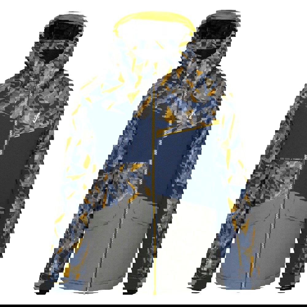 Dare 2B Kids Glee II Geometric Ski Jacket in moss yellow and agave green with a geometric, logo all-over print. The lining combines recycled polyester and scrim, with low bulk fill and insulating fabric technology. ARED 20/30 construction adds waterproof and breathable performance, supported by taped seams and a DWR finish. Reflective detail, a snowskirt and inner sleeve bands complete the ski-ready build.