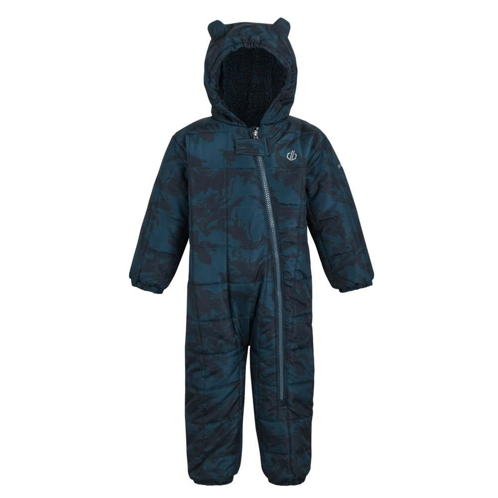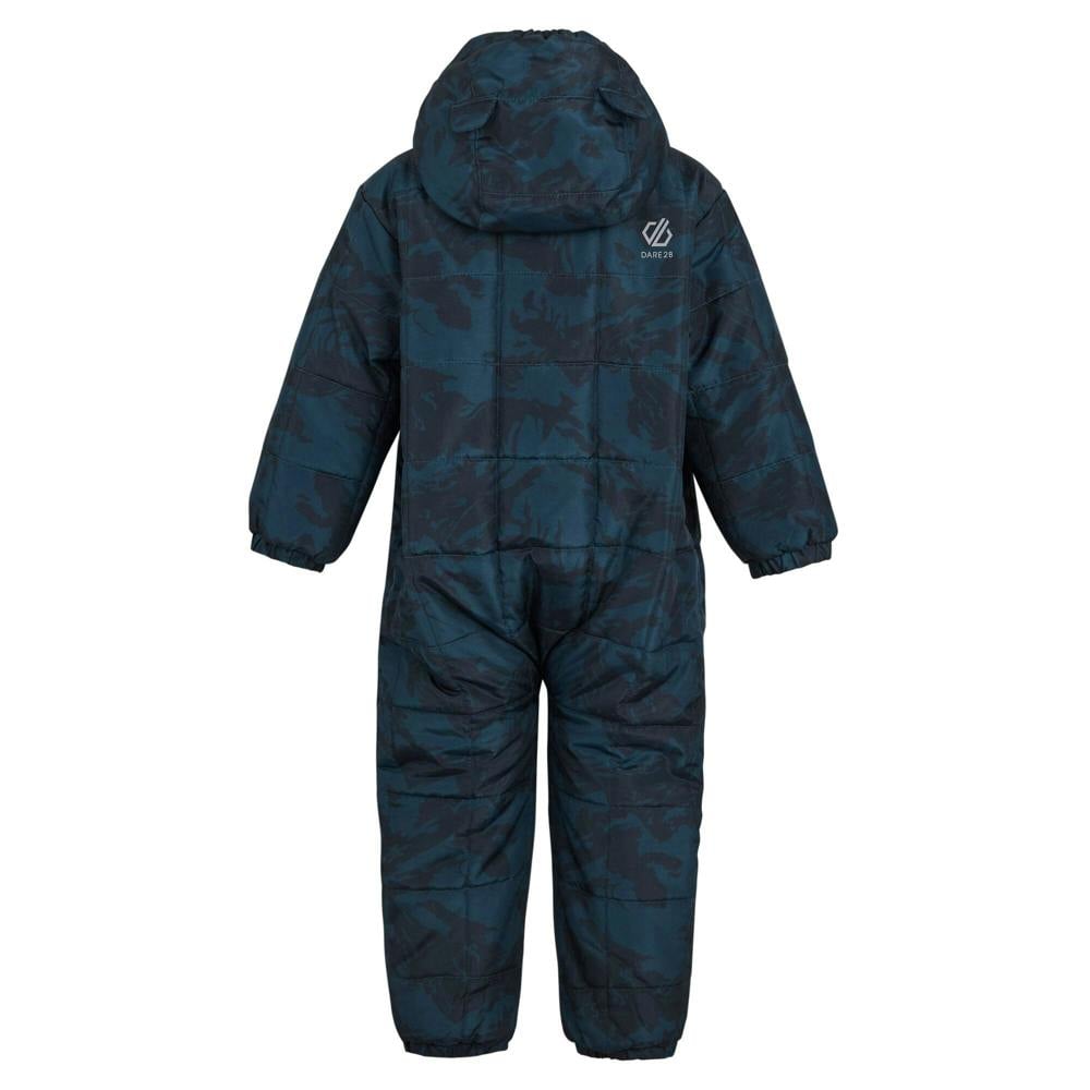 Dare 2B Kids Mountain snowsuit in Moonlight Denim, made from 100% recycled polyester. The all-over print design includes logo detailing and a quilted finish. A full zip fastening runs through the front for straightforward dressing.