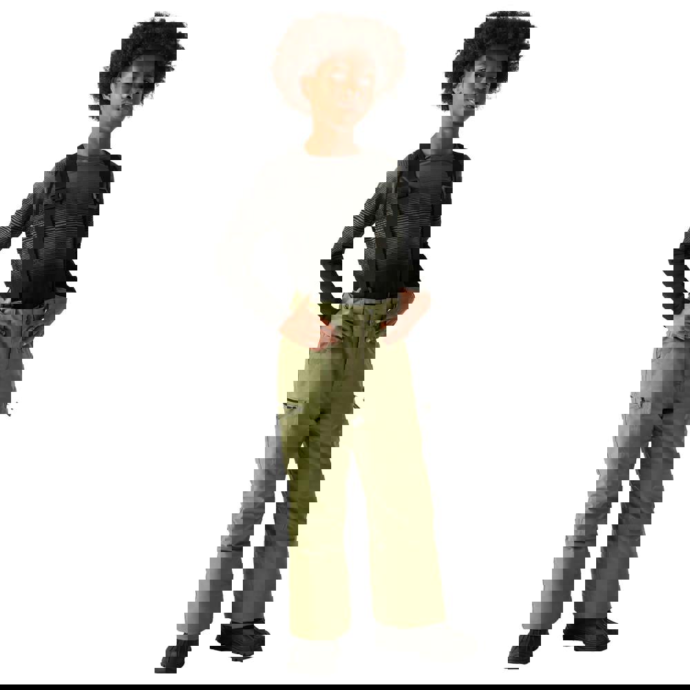Dare 2B Kids Pow II ski trousers come in martini olive with a distressed design and logo detail. Made from 100% recycled polyester with stretch fabric, they include a fleece lining and padded construction. ARED 30/30 fabric technology provides waterproof, water repellent and breathable performance, with taped seams and a PFC-free finish that is also PFOA-free and PFOS-free.