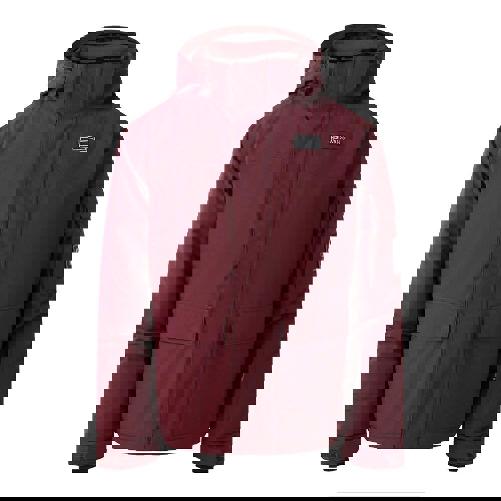 Dare 2B Kids Shredder Ski Jacket in fig, made from 100% recycled polyester with a printed finish. ARED 30/30 fabric technology combines breathable performance with a waterproof, water repellent finish. The jacket is padded and includes taped seams, plus an integrated snowskirt and a scrim back panel.
