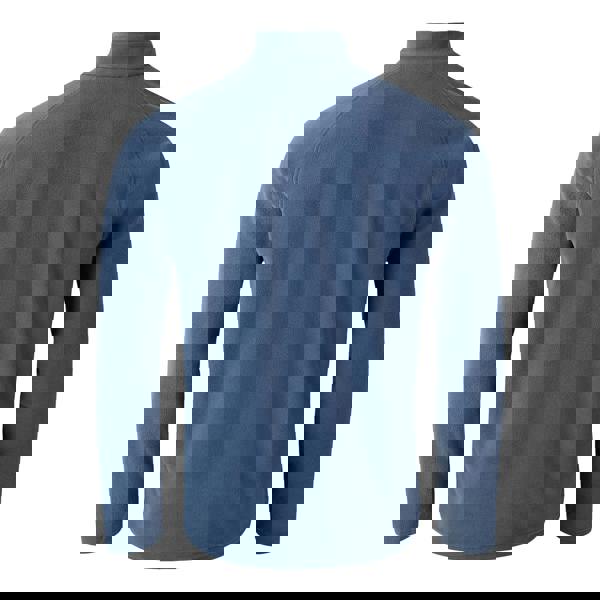 A half-zip fastening allows quick adjustment, while the chin guard and zip guard add practical detail at the neckline. Finished in blue indigo, it suits everyday casual wear when you want lightweight warmth without bulk.