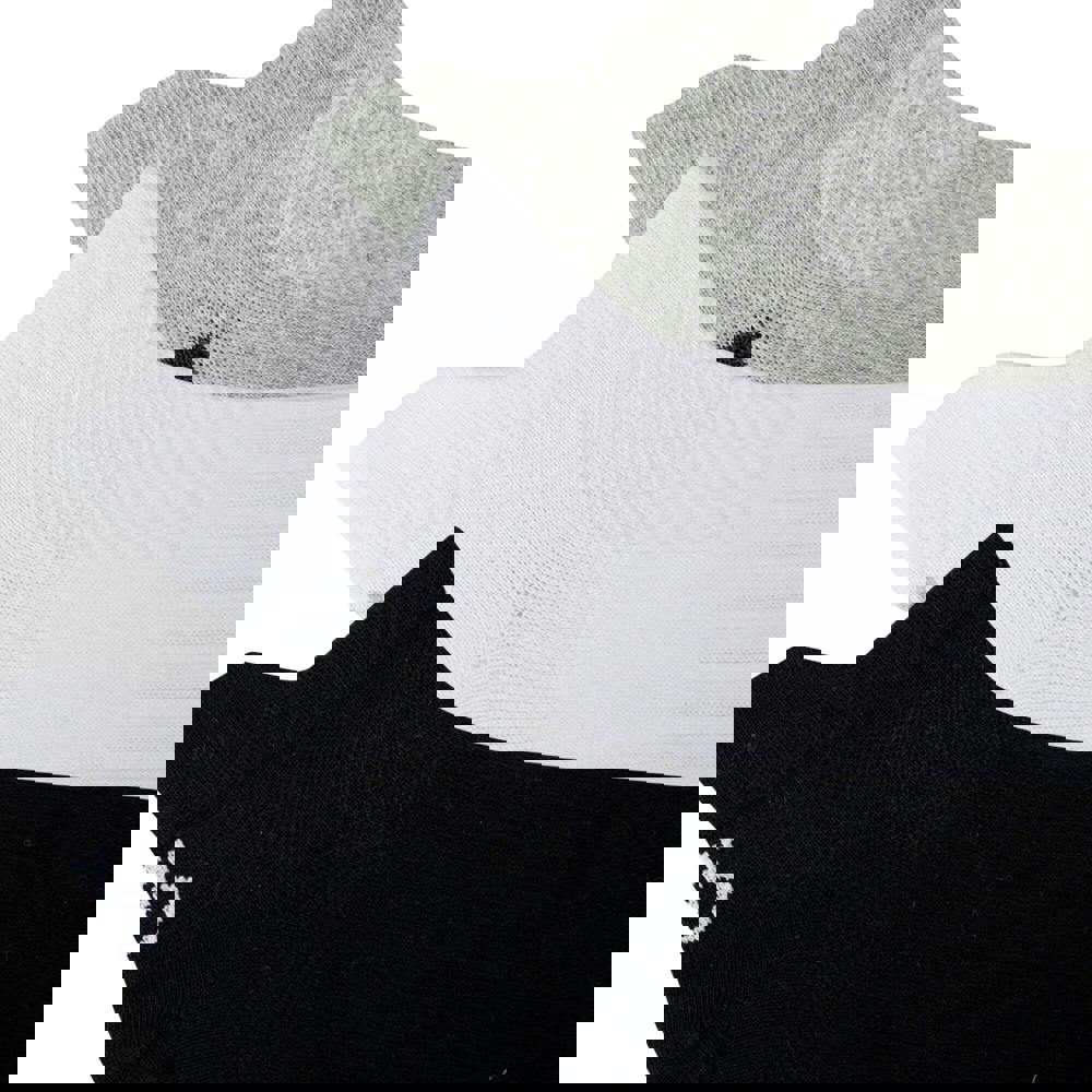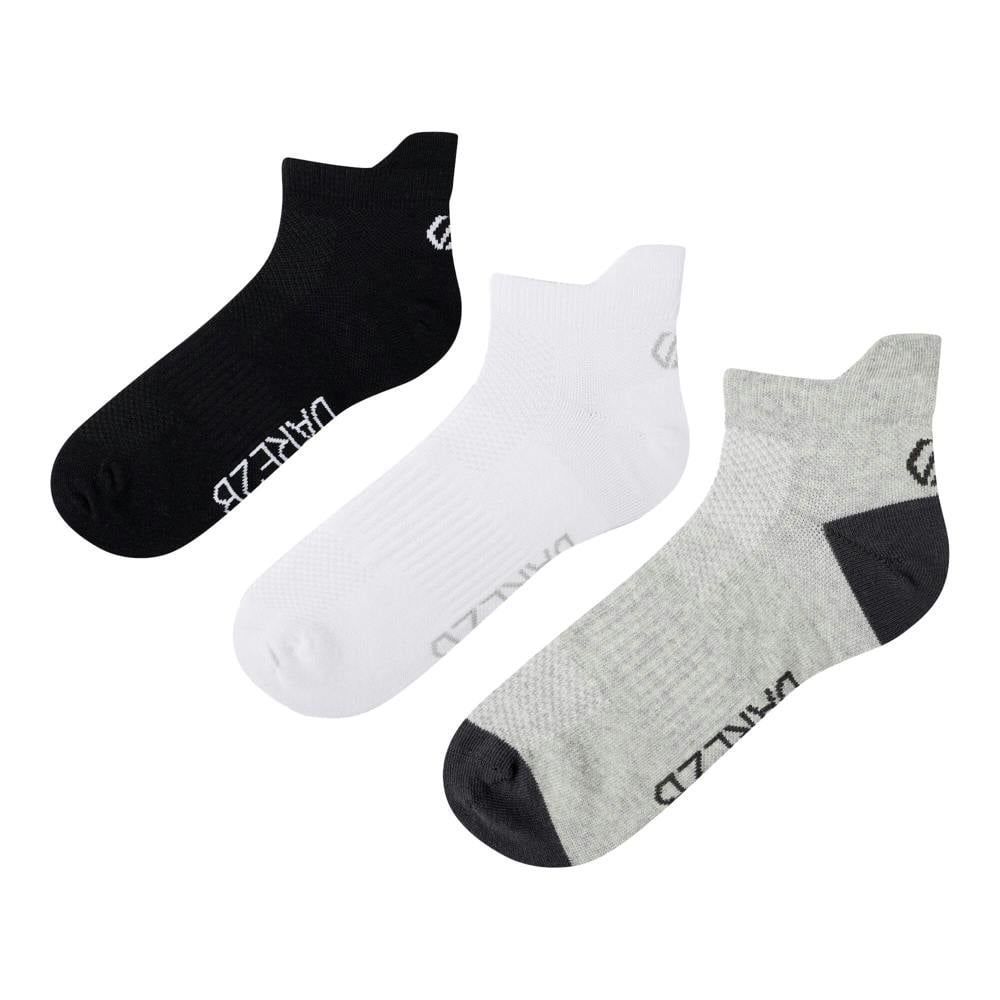 Dare 2B Movement trainer socks come in a pack of three pairs in black, white and grey marl. Made from a cotton-rich blend with added polyester, elastodiene and elastane, they combine performance stretch with a plain finish and logo detail. Built for trainer wear, each pair includes arch support and a fitted ribbed cuff for a secure feel.