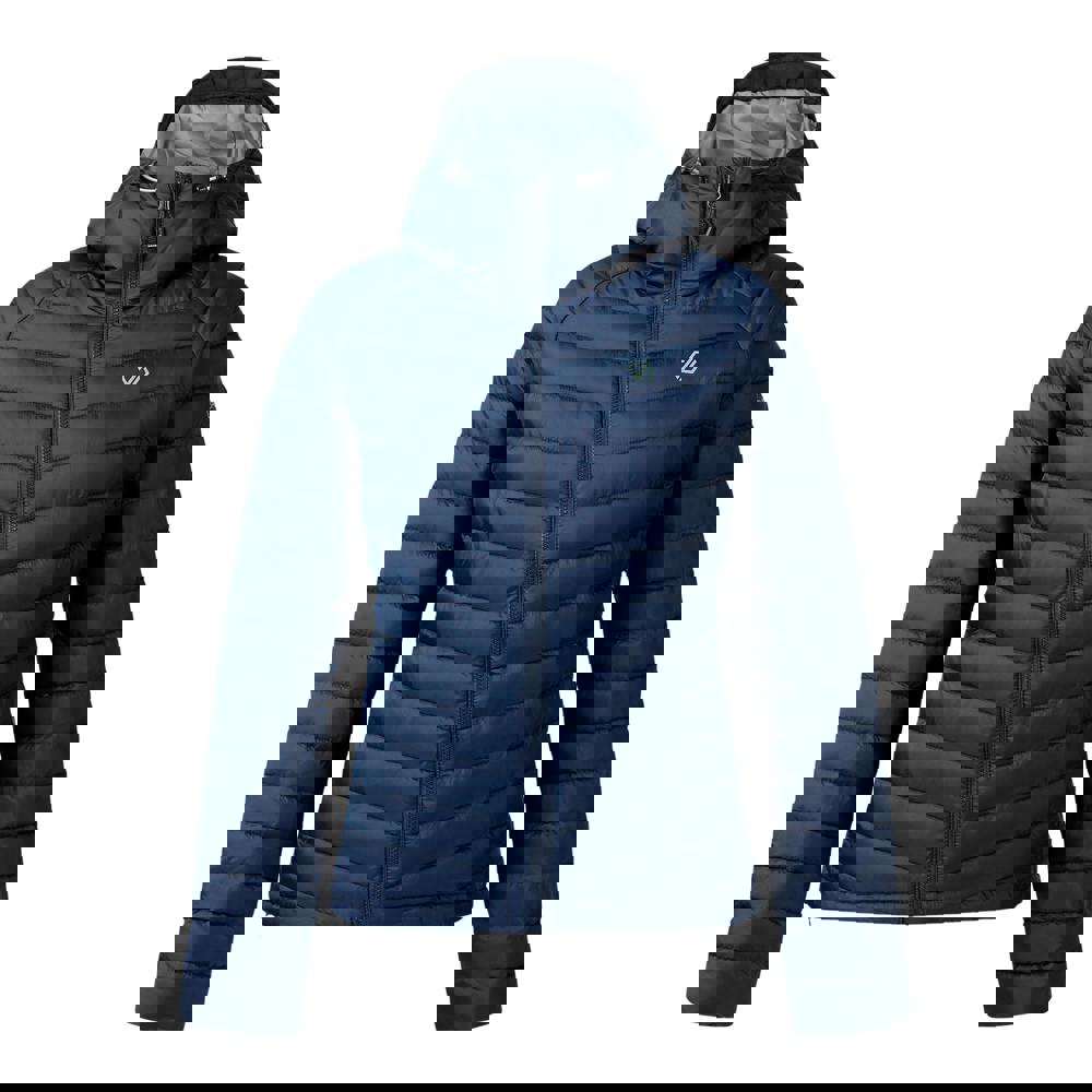 The Dare 2B Air Lite Baffled Jacket in navy is made from 100% recycled polyester with a ripstop fabric construction. It has a plain finish with logo detailing and a lightweight, insulated build.