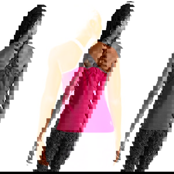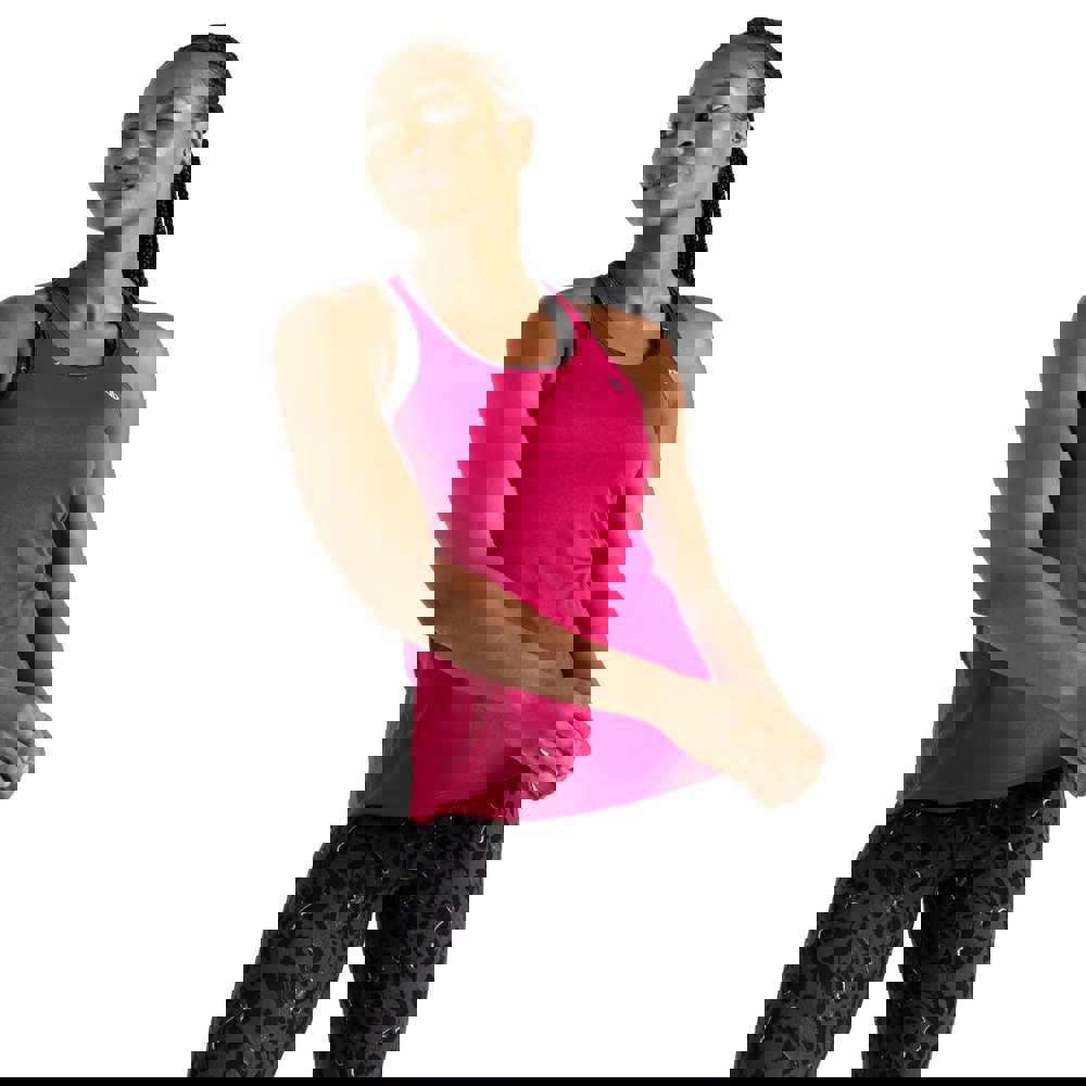 This sleeveless vest top is made from recycled polyester and finished in a berry pink and black dash print with logo detail. A round neckline and cross-back style create a clean, sporty silhouette, while flat locked seams help keep the finish smooth.