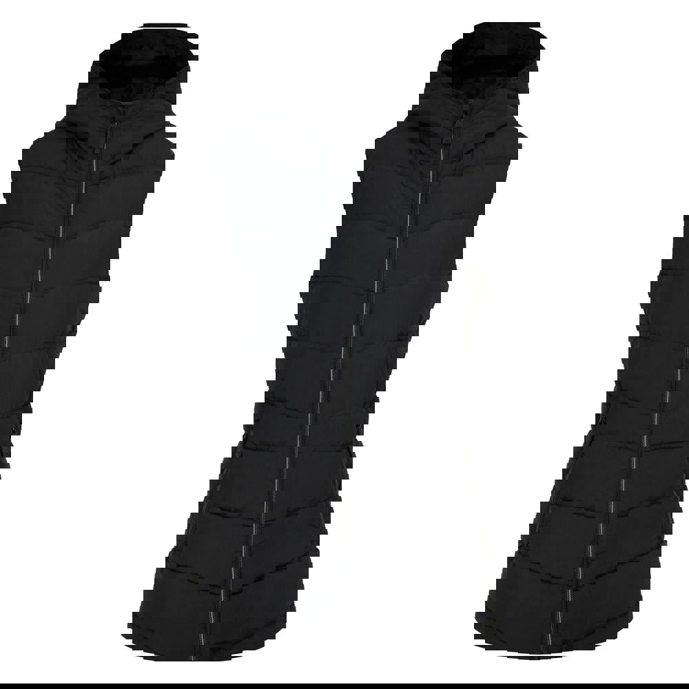 A grown-on hood and chin guard add practical coverage, while the padded build supports warmth. The front closes with a full zip and an inside zip, and two lower zip pockets keep small essentials secure. The material technology is listed as high warmth, insulating, thermal, showerproof and water repellent, and it is PFC free, PFOA free and PFOS free.