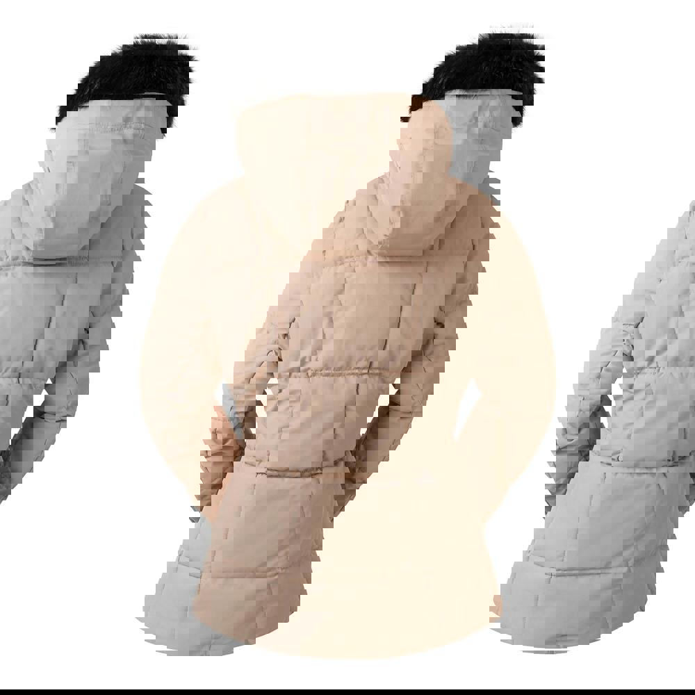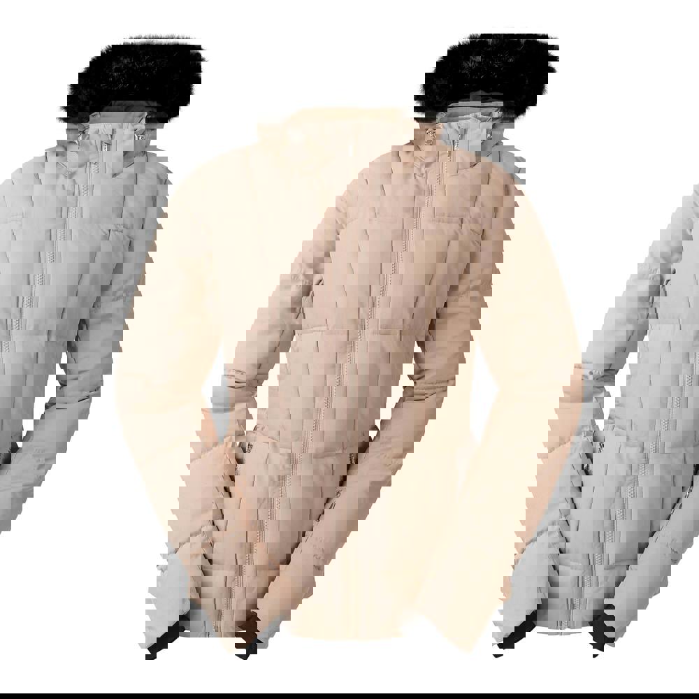 The Dare 2B Glamourize VI ski jacket comes in warm taupe with a printed design and long sleeves. It uses Ared fabric technology and is breathable, water repellent and waterproof, with a waterproof rating of 10000mm and breathability of 10000g/m²/24hrs. The jacket is padded and includes an integrated snowskirt for on-slope wear.