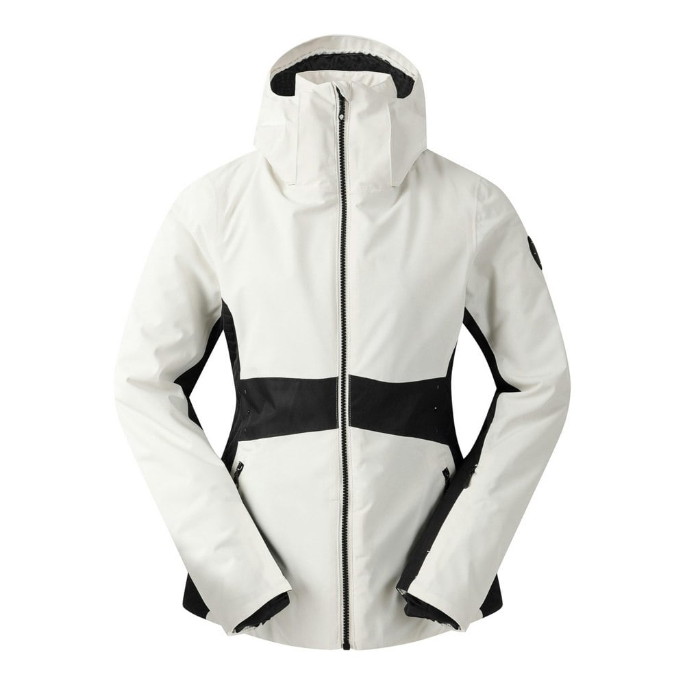 A hooded neckline and long sleeves create a practical outer layer for time on the slopes. The detachable hood adjusts for a secure feel, while the cuffs combine adjustability with an inner stretch finish. Padding, an integrated snowskirt and a goggle lens wipe cloth add ski-focused detail. Storage includes two side pockets with zip closure, plus a ski pass pocket, inner pocket and stow pocket. The hem adjusts via a shockcord, and the jacket fastens with a full zip.