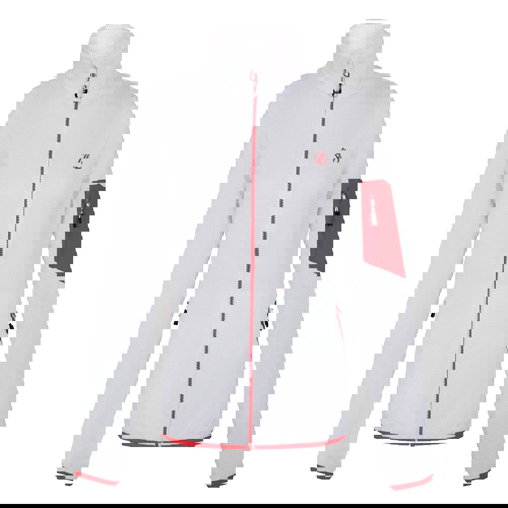This full zip fleece jacket from the Dare 2B Mountain Series is made from polyester and uses knitted construction with mesh backing and stretch. It has a high collar and long sleeves, finished with contrast detailing including a contrast edge cuff and contrast hem. A logo detail completes the look.