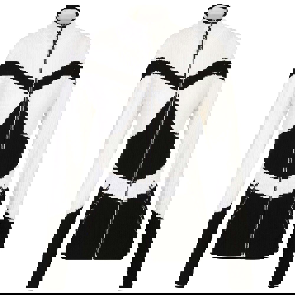 This women’s zip sweater top is made from a cotton and viscose blend in a knitted jacquard fabric. It has a colour block design in black and white, with thermal fabric technology for added warmth.