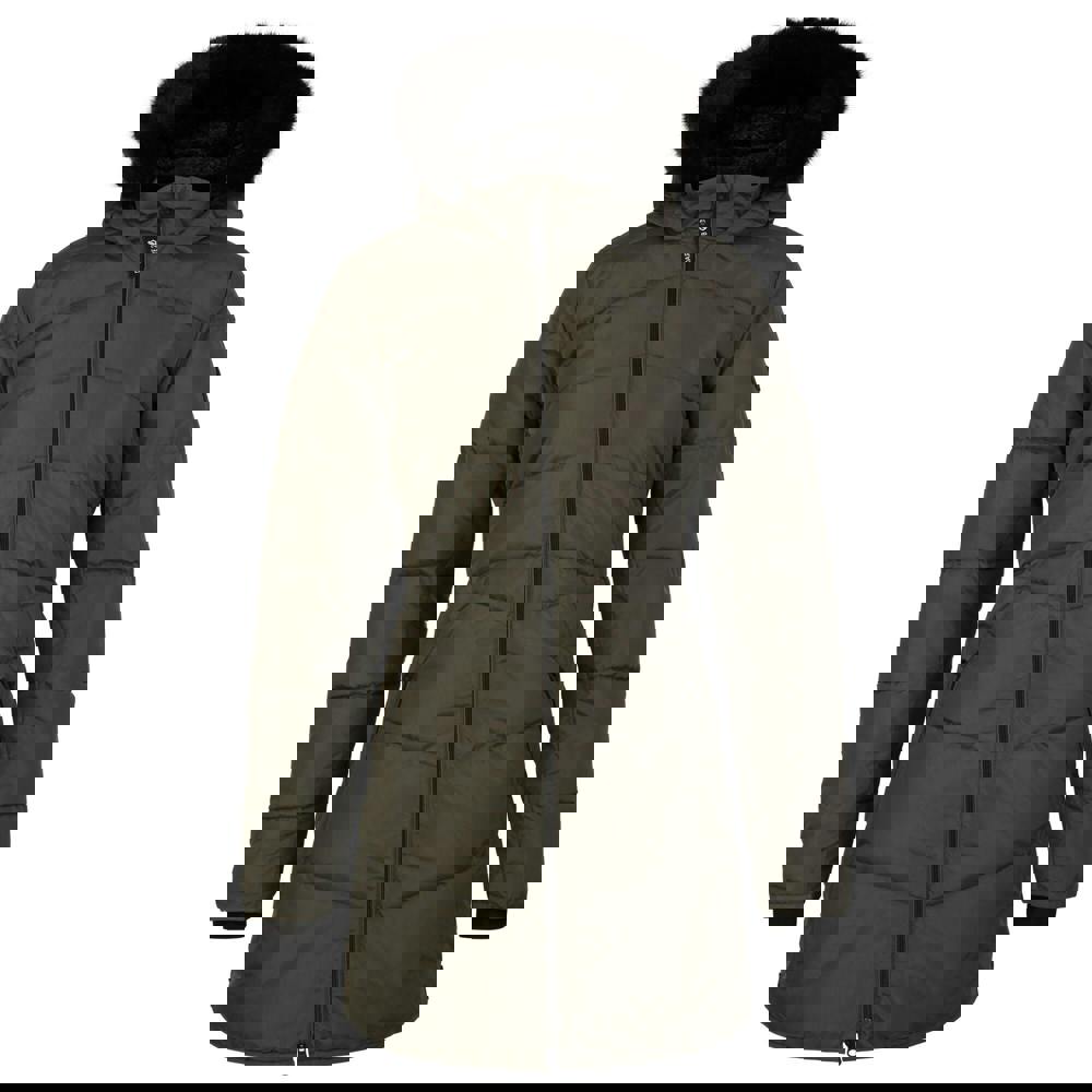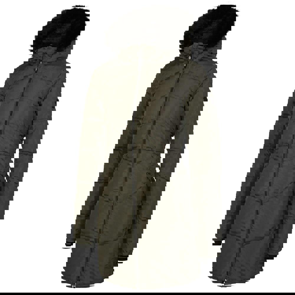 The Striking III padded jacket from Dare 2B is made from 100% polyester and uses recycled materials. Finished in Green Lichen, it has a longline length with a quilted design and a cire-finish lining. Ared 10000 fabric technology combines waterproof, breathable and temperature control properties, with a DWR finish.