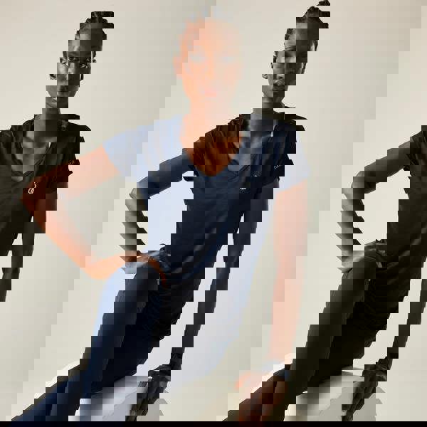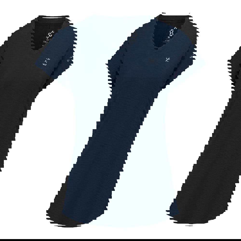 This active T-shirt is made from 90% polyester and 10% elastane, with Q-Wic stretch material and quick-dry technology. It has a navy finish with a logo design, making it a practical option for active wear.