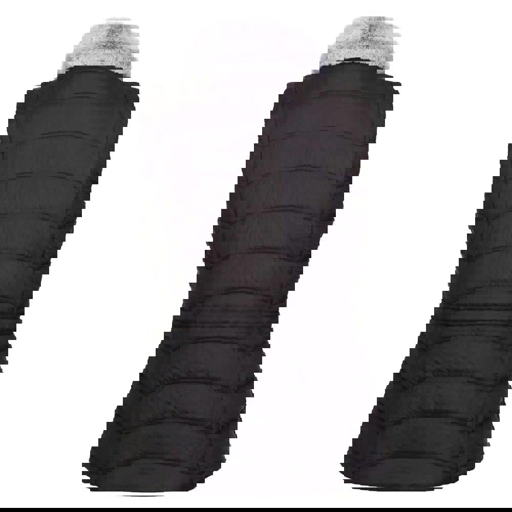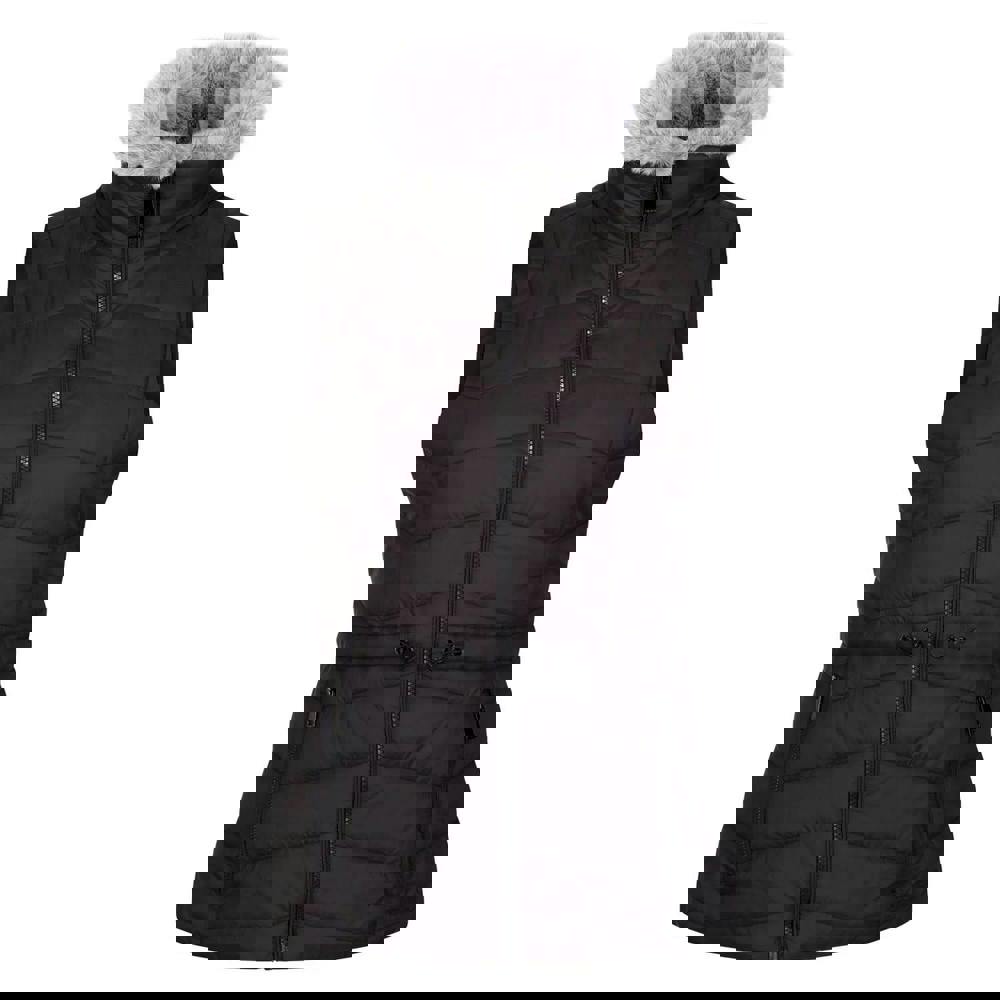 Cut in a sleeveless shape, it has a high neck with a faux fur collar for added coverage. A full zip fastening runs through the front, with two zipped front pockets for small essentials. The waist is adjustable with a drawcord.