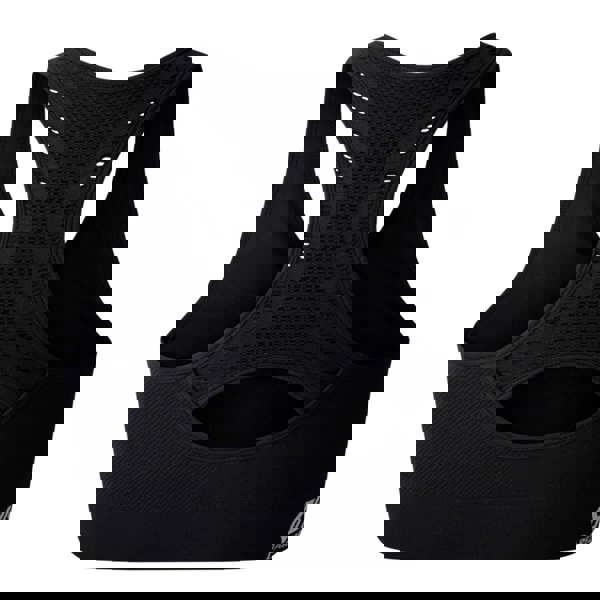 Built for medium support, it has a seamless construction with laser cut detailing and a racerback shape. The form-fit silhouette is finished with removable padded cups for adjustable coverage.