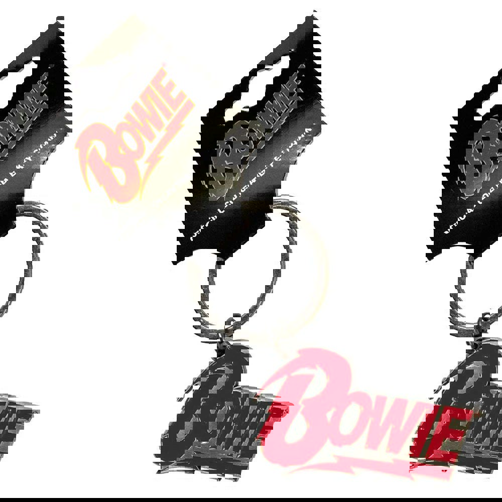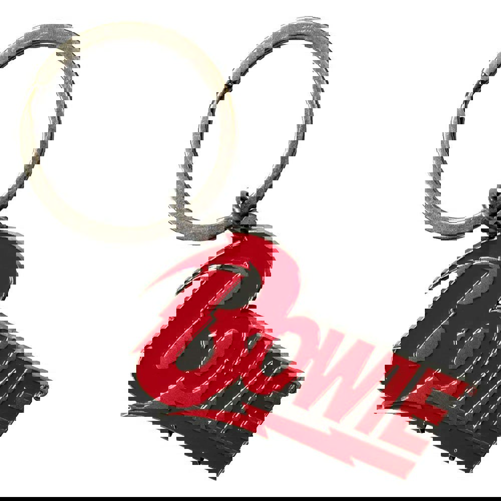 Official licensed David Bowie Keychain featuring the 'Logo' design motif. High quality zinc alloy keychain featuring soft enamel infill, die casting, sand texture background, antique silver coloured plating.