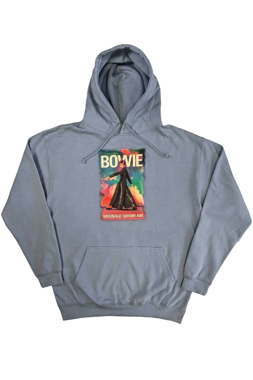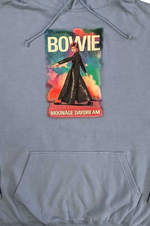 An official licensed David Bowie Unisex Pullover Hoodie featuring the 'Moonage 11 Fade' design motif. This high quality Pullover Hoodie is available in a light blue colourway. High quality cotton unisex fit hoodie featuring drawstring hood, pouch pockets and front printing. Comes in a wide range of sizes from Small through XX-Large, subject to availability.
