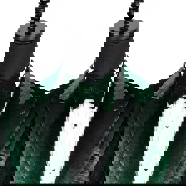 Long sleeve modal-blend velvet blazer in green, featuring a peaked lapel collar with a tonal felted undercollar. Designed with a single-button closure and flap pockets at the waist. Includes padded shoulders and four-button surgeon’s cuffs with a fully multicoloured patterned lining for a refined, stylish finish.