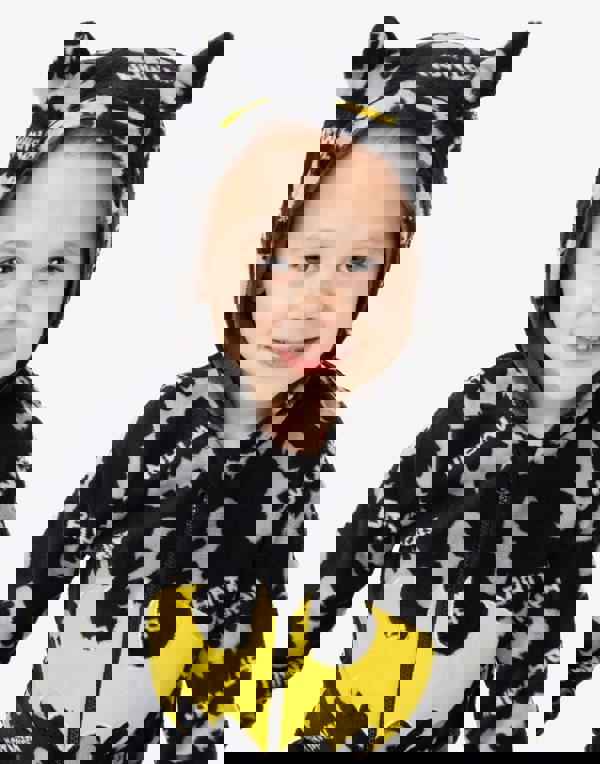 Settle in for downtime with the DC Comics Batman onesie, a fleece all-in-one finished with official branding throughout. Styled in grey with yellow and black details, it carries an all-over Batman logo print and an appliqué logo for a bold, character-led look.