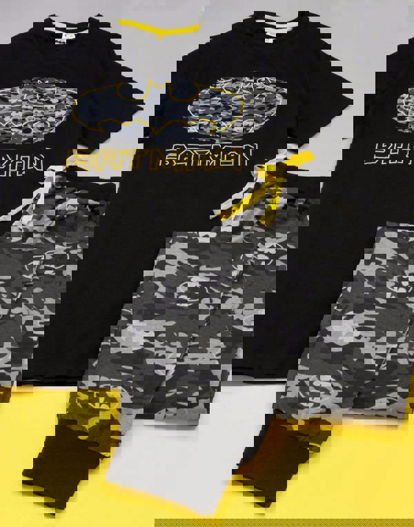 The top features the Batman logo composed on a camouflage print paired perfectly with camo shorts or trousers with a yellow adjustable drawstring waist
