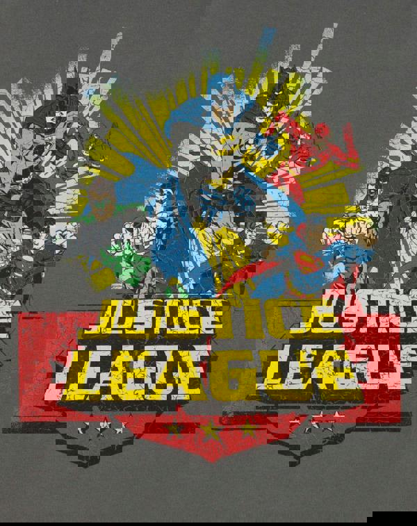 The print across the front of the tee sees the classic lineup of the superhero team: Batman, Superman, Green Lantern, and The Flash are seen leaping into action, fronted by the Justice League logo in a bold comic-book style, finished by an overall cracked distress effect