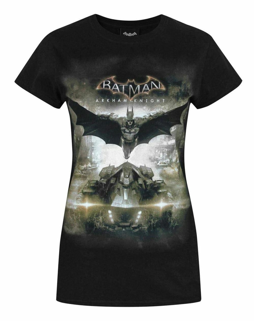 The design across the front of this ladies t-shirt features the cover art for the Batman Arkham Knight video game