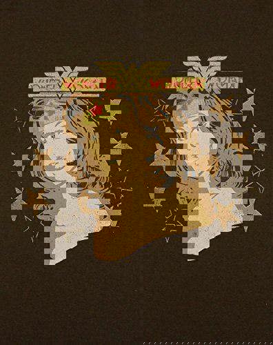 The retro brown t-shirt features a large print of Wonder Woman in a vintage inspired graphic design across the front of the t-shirt