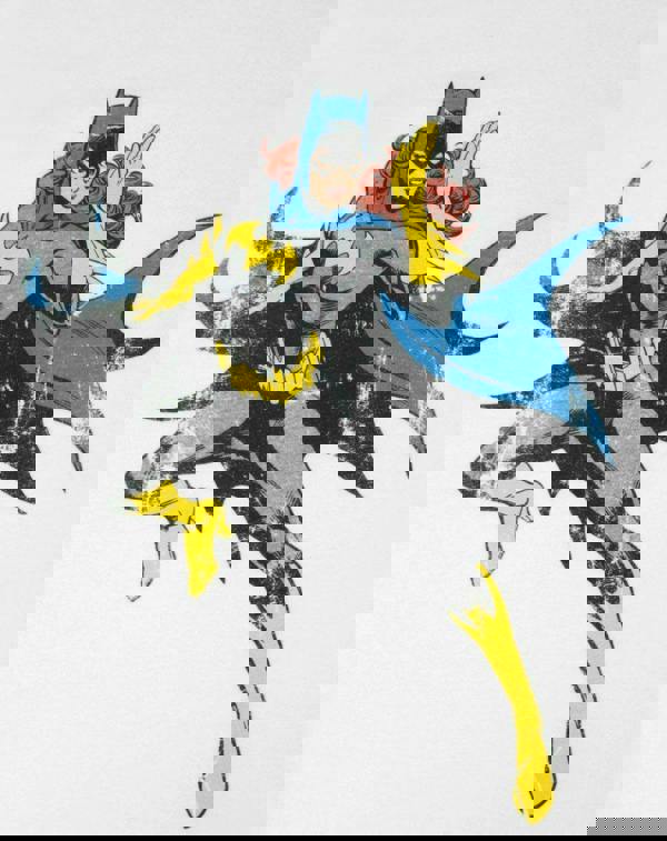 The large print across the front of the t-shirt sees the iconic look Batgirl sailing through the air in her classic grey, yellow and blue costume