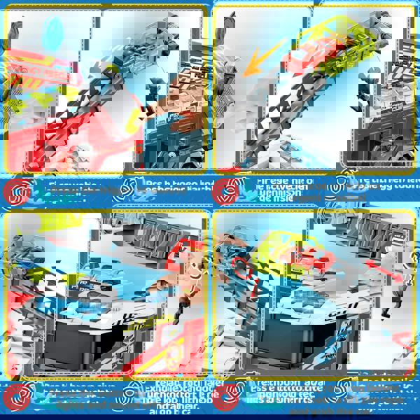 The 2-in-1 transforming design easily converts from a fire engine into a mega rescue playset with a launch ramp and ladder, featuring interactive buttons to launch mini cars and simulate rescue missions while encouraging imaginative firefighter role play, and includes a complete set with mini vehicles, ladder, water jet accessory, walkie-talkie, and more for all-in-one action-packed fun