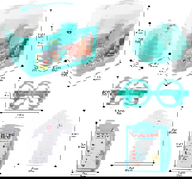 CONTENTS: Carry case includes: glasses, doctor's clipboard, doctor's ID card, thermometer, stethoscope, tweezers, mouth mirror tool, syringes, medicine tablets box, sphygmomanometer (for blood pressure), pulse oximeter, toothbrush, dental probe, dentist drill and denture (plastic set of teeth).