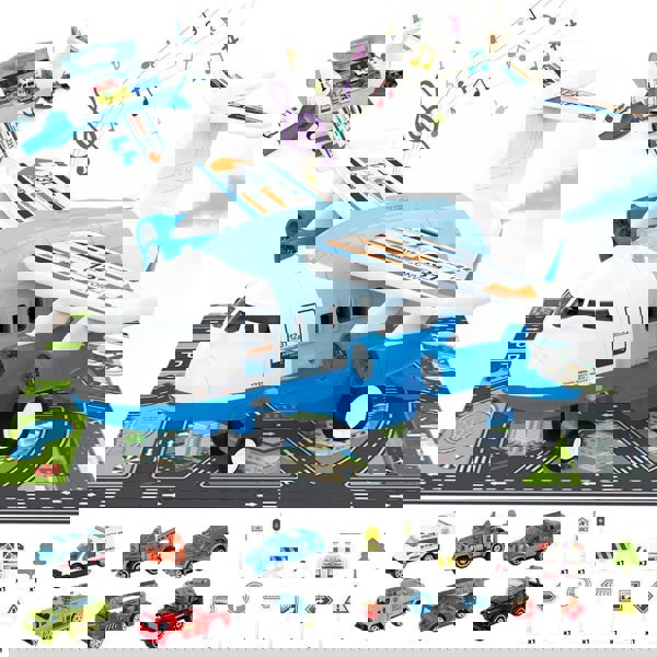 Storable Mini Cars & Accessories: The openable cabin of the airplane stores mini cars and road signs, keeping the playset organized. Opening the tail section allows cars to slide out using inertia for added interactive fun.