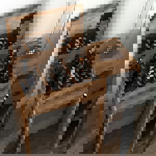 Agnes makeup vanity table with mirror is a perfect addition to your modern beauty routine. This new, water-resistant dressing table features an integrated mirror, three open storage shelves, two cabinets, and a storage drawer for all your makeup needs. With quality construction and thoughtful details like concealed metal hinges and plastic handles, this vanity table is both functional and stylish. Made in Türkiye from durable 18 mm thick particleboard with a sleek melamine veneer finish, the makeup vanity table is ready to elevate your daily beauty ritual.
