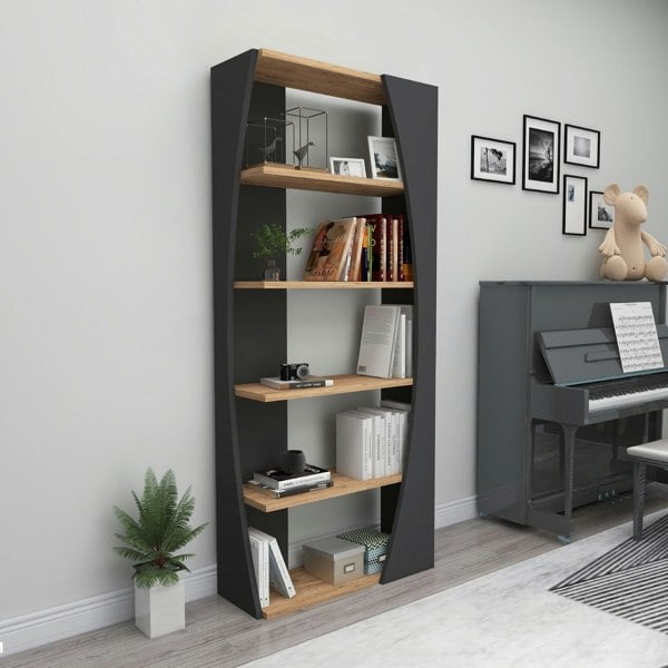 Nestor bookcase with 5-tier shelves is a modern storage solution that is stylish and highly functional. Made of 18 mm thick particleboard with a melamine veneer, the bookcase is water-resistant and features an impressively strong curved construction. Great for organizing your home or office.
