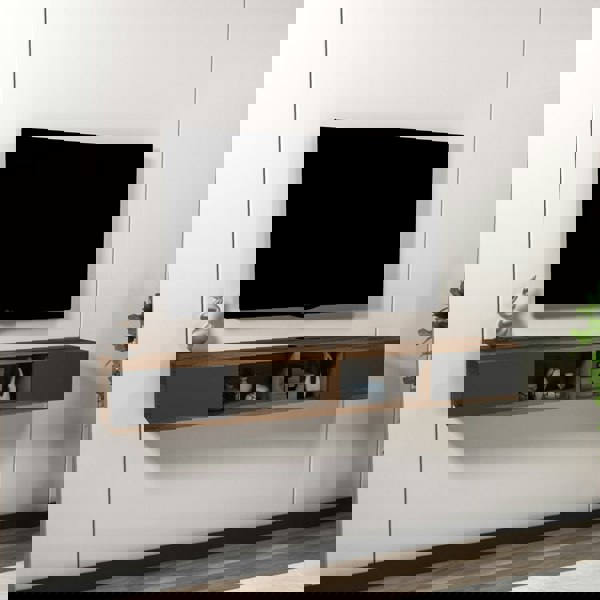 The modern floating TV stand can accommodate up to 60-inch flat-screen TVs. It is a modern solution to your wall-mounted TV storage and decor needs. Made of durable 18 mm thick melamine-coated particleboard, this stand is not designed to hold a TV. With four open shelves and a water-resistant surface, it offers plenty of storage options. Wall mounting hardware and assembly hardware and instructions included.
