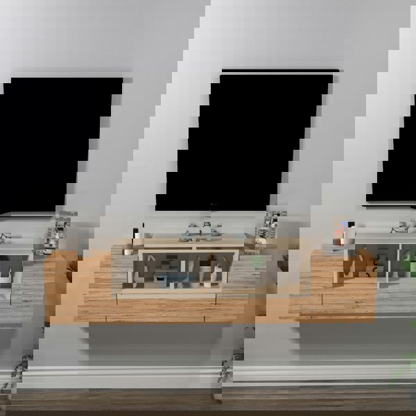 Elevate your living room with the sleek and modern Morica Floating TV Stand. Designed to accommodate flat-screen TVs up to 65 inches, this stand features two open shelves for easy access to media devices and two cabinets for discreet storage. Made of durable particleboard with a water-resistant finish, this stand will withstand the test of time. Wall mounting hardware is included for easy installation.