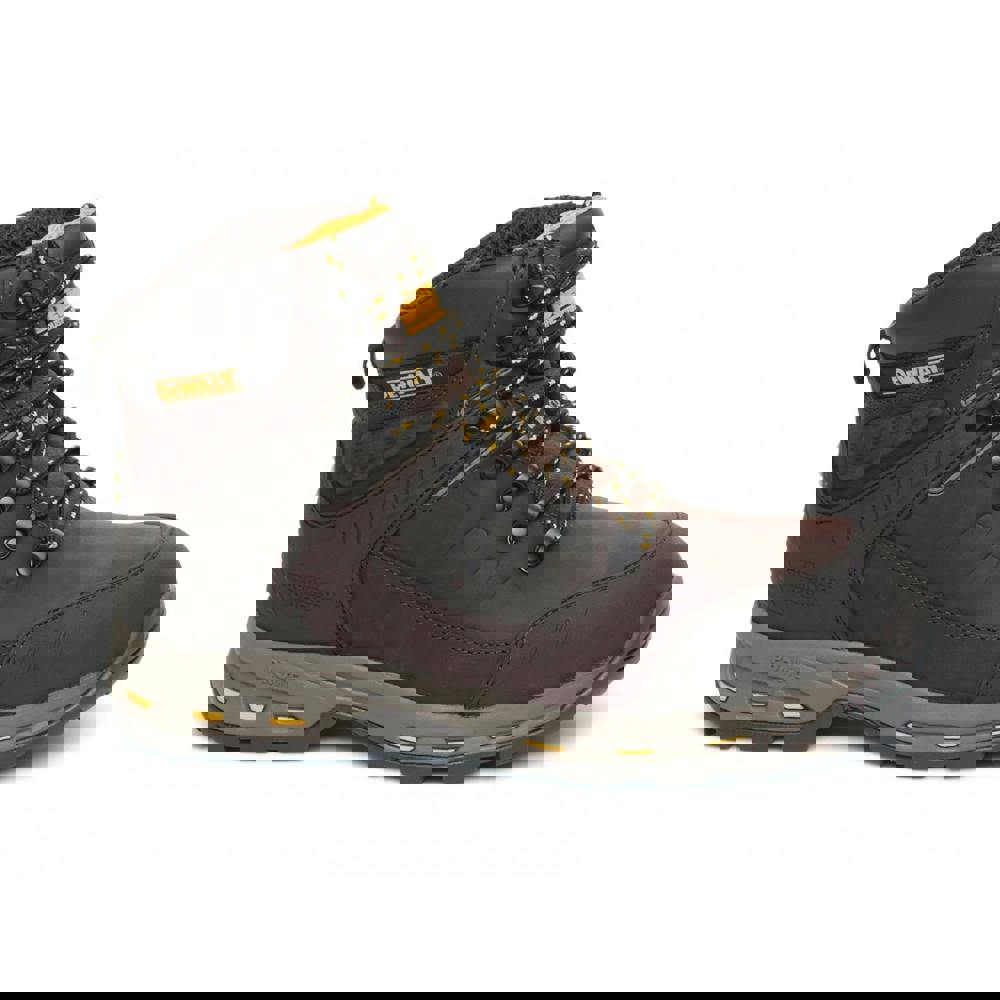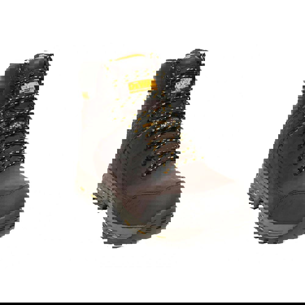 DEWALT Kirksville S3 Pro-Lite safety boots are made with water-resistant leather uppers and built for protective wear. An aluminium toe cap and composite midsole provide certified safety performance, supported by a TPU toe guard for added protection. A TPU heel piece adds ankle support, while a lightweight Phylon/rubber Pro-Lite outsole completes the construction.