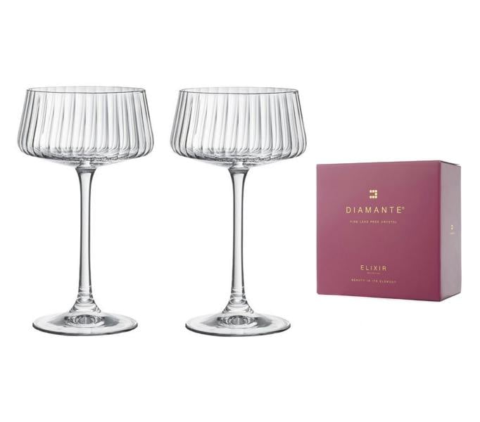 Two crystal champagne saucers featuring our stunning Mirage design. These glasses are also well suited for cocktails or serving ice-cream and small appetisers. Crafted from premium lead free crystal. presented in a beautiful gift box.