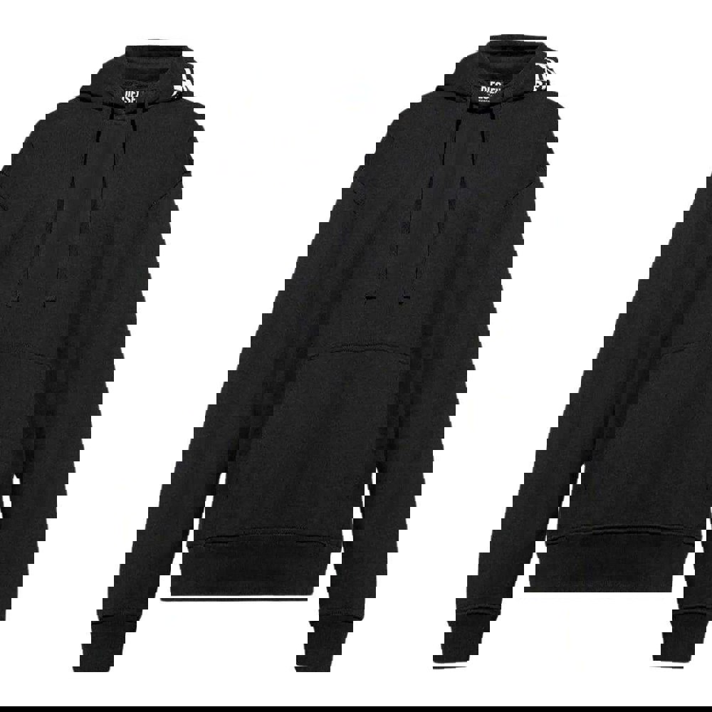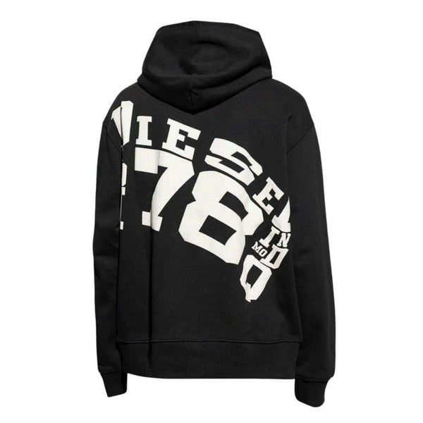 This Diesel hoodie is made from 100% cotton and finished in black with a logo and back print. A hooded neckline and long sleeves give it a classic pullover shape for everyday wear.