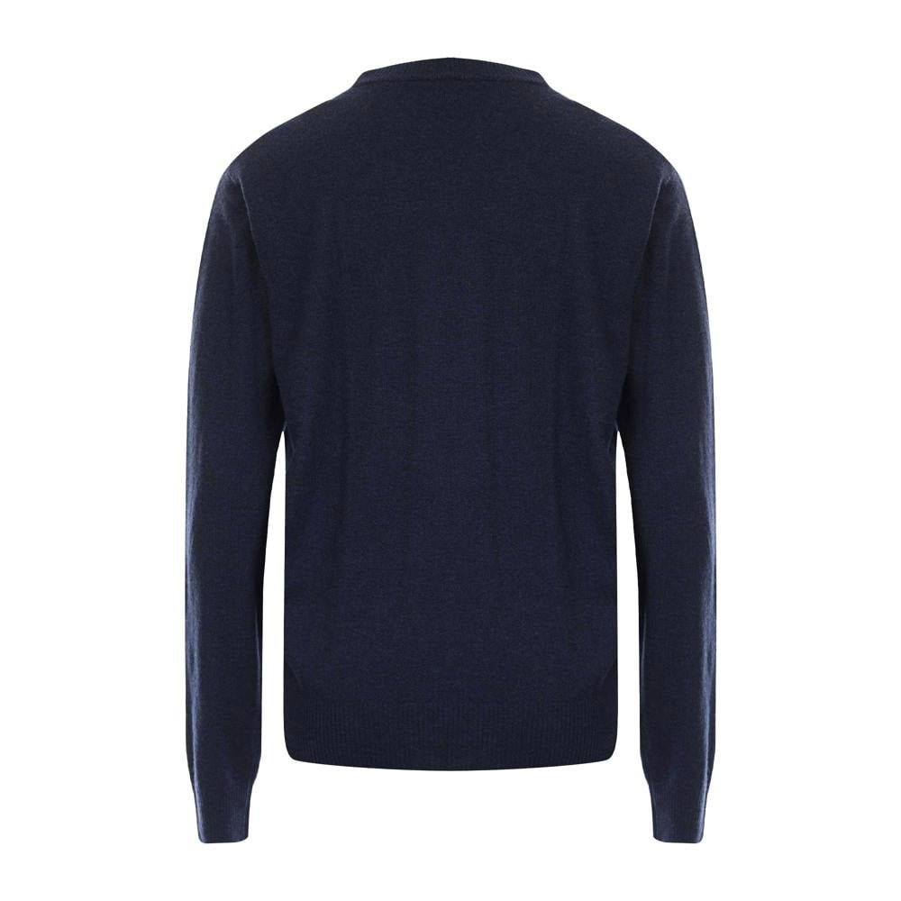 This men’s crew neck sweater top comes in blue with a printed logo design. It is made from an 87% wool and 13% cashmere blend and finished with a ribbed crew neckline.